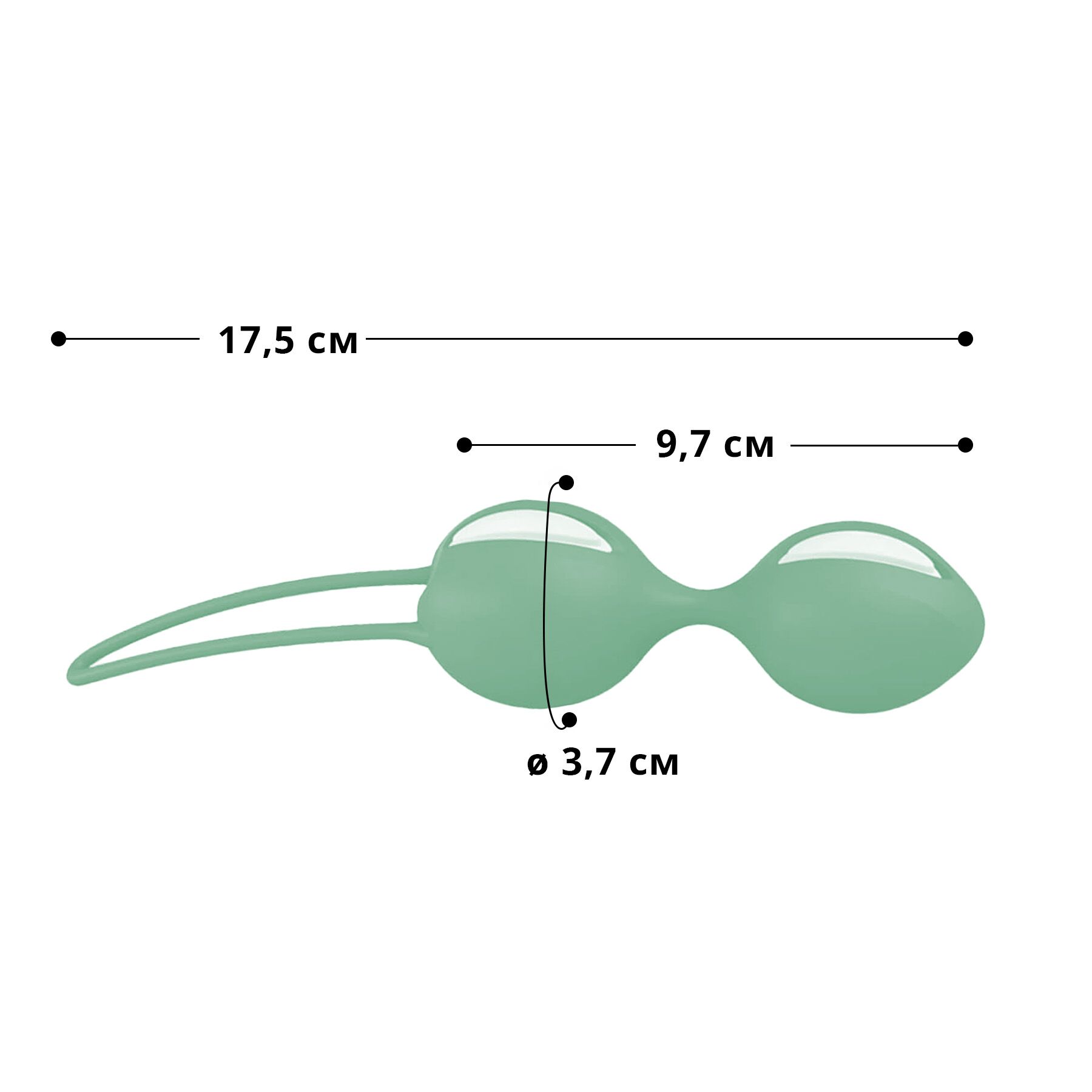 - Два шарика разного диаметра: меньший (3,2 см) и больший (3,6 см) обеспечивают комфортную и эффективную тренировку интимных мышц.