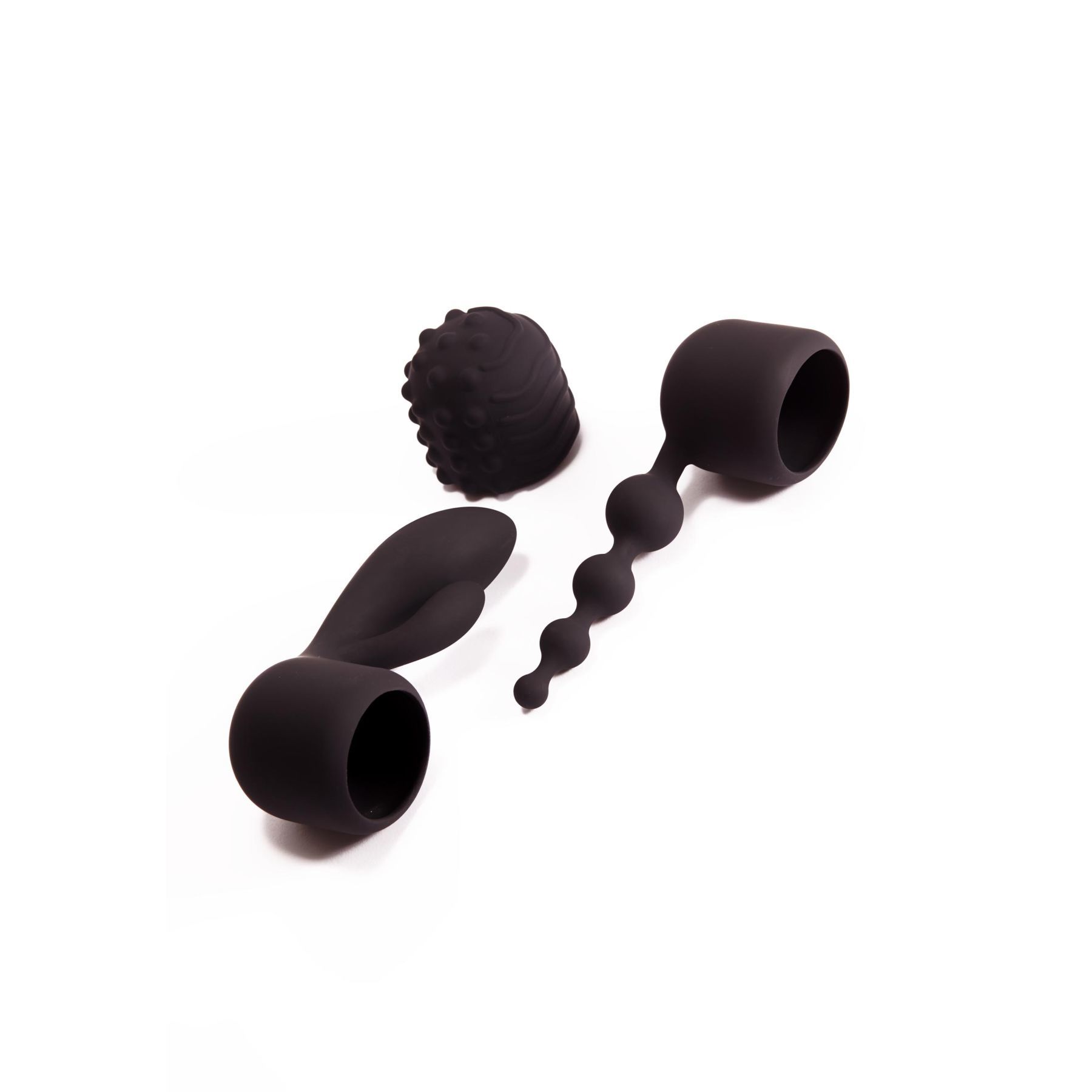 • интимный аксессуар предлагается с тремя силиконовыми насадками – гладкой насадкой с анальной цепочкой, деталью с клиторальным кроликом, рельефной головкой;
